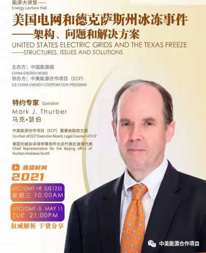 中美能源合作项目(ECP)与《中国能源报》能源大讲堂首度合作,邀请ECP董事会联席主席马克•瑟伯先生,于2021年5月12日10点,和大家在线分享《美国电网和德克萨斯州冰冻事件——架构、问题和解决方案》。