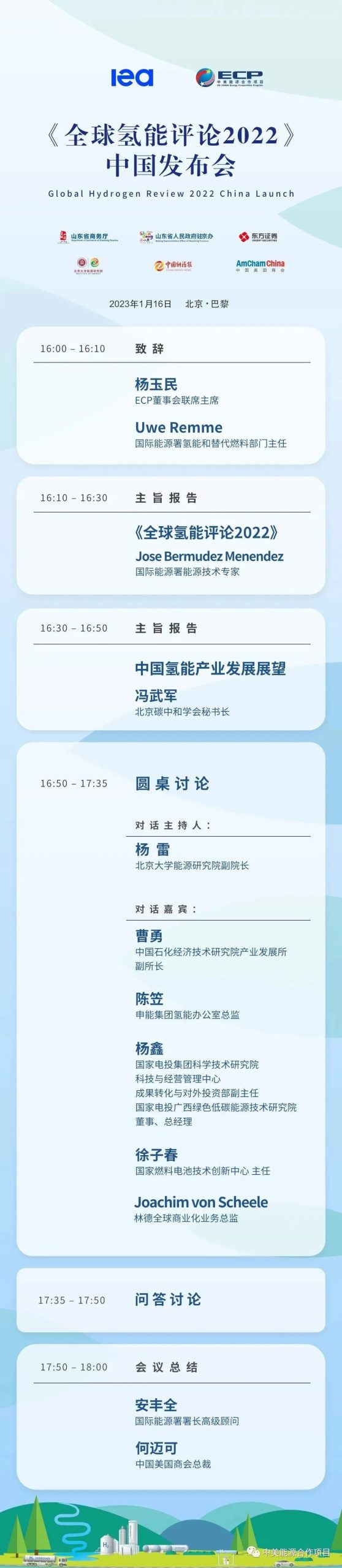 国际能源署(IEA)和中美能源合作项目(ECP)将于2023年1月16日北京时间16:00-18:00,巴黎时间09:00-11:00,中英文双语线上线下同步组织举办《全球氢能评论2022》报告中国发布会。